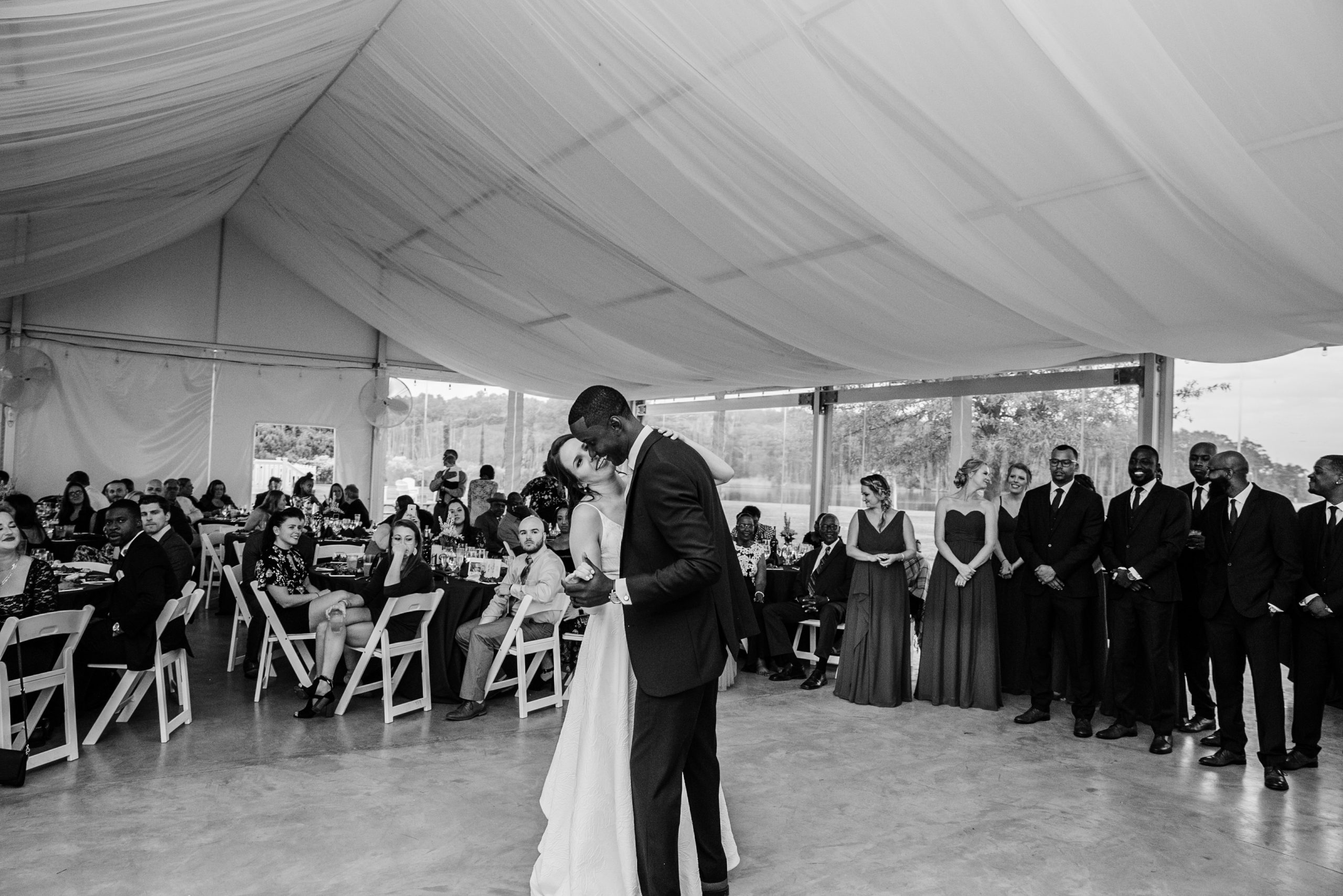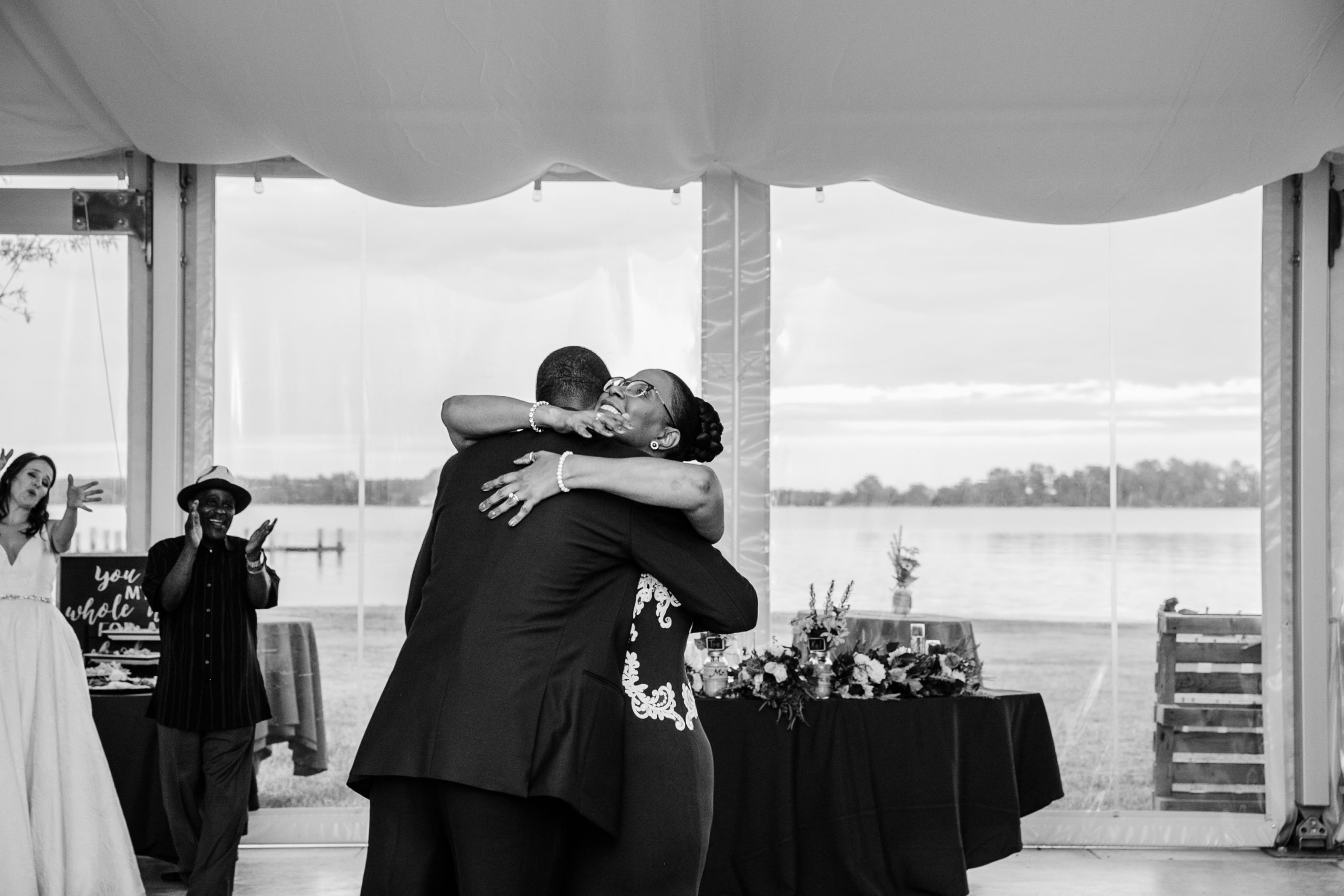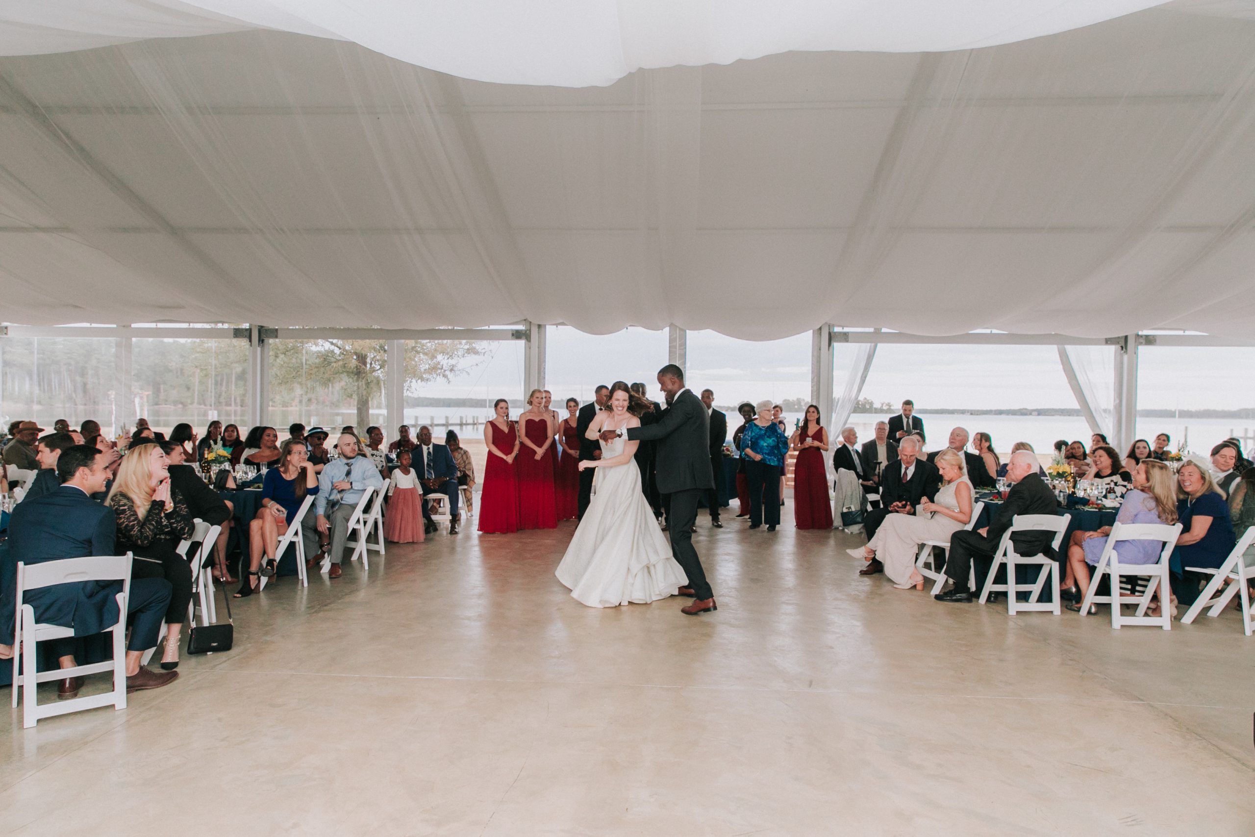 The tent is an 80’x50′ enclosed (but can open) tent with a solid floor, perimeter lighting, white draping from the ceiling, hanging greenery chandelier that add light and clear vinyl all along the waterside so your water view is always there. During events a cocktail area is set with string lighting, high top tables and a bar.
