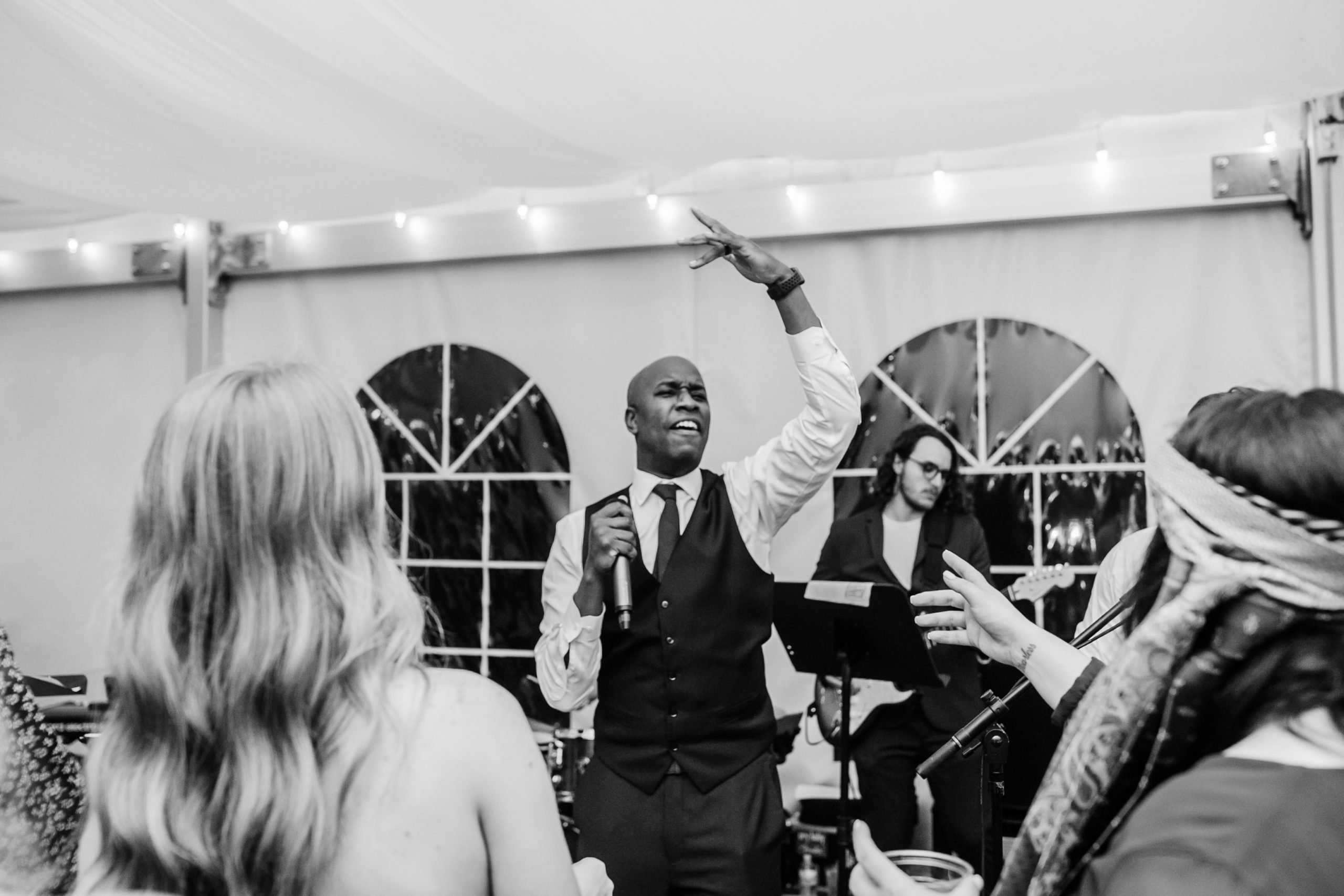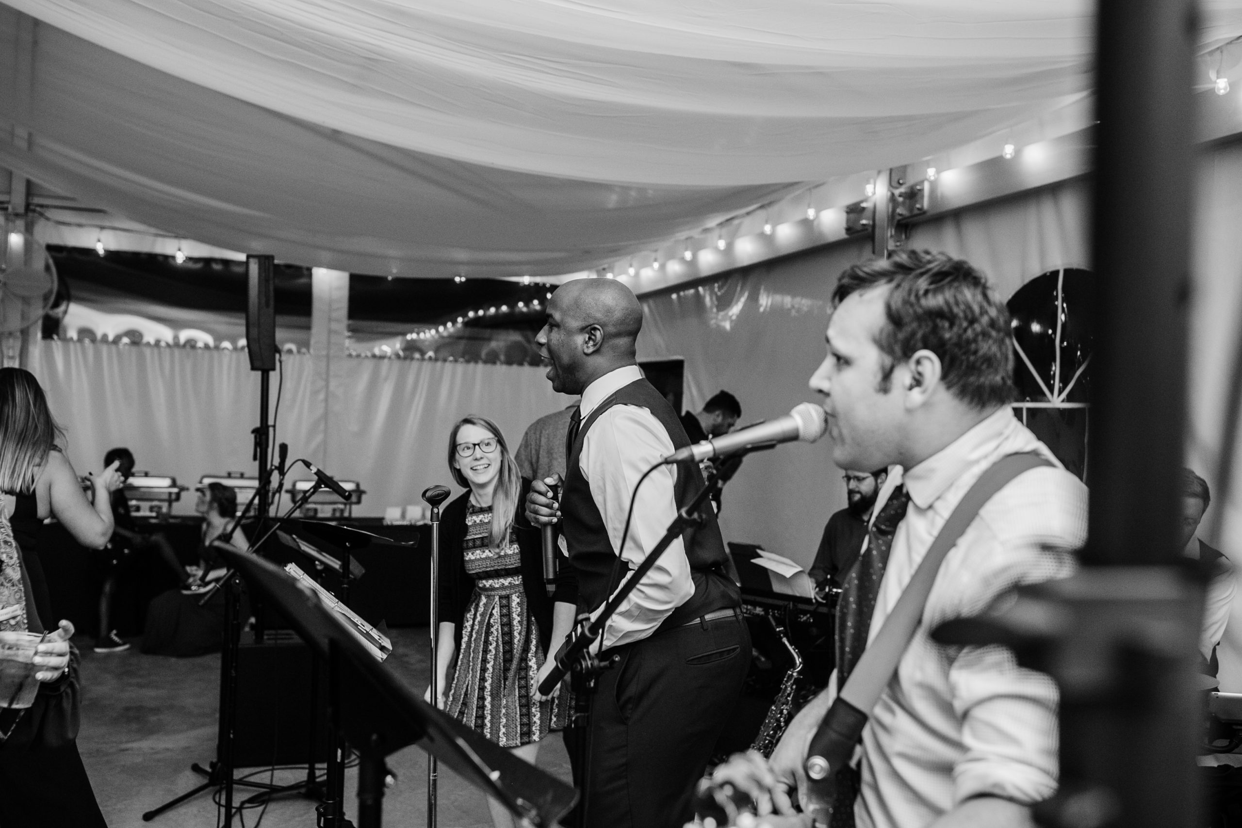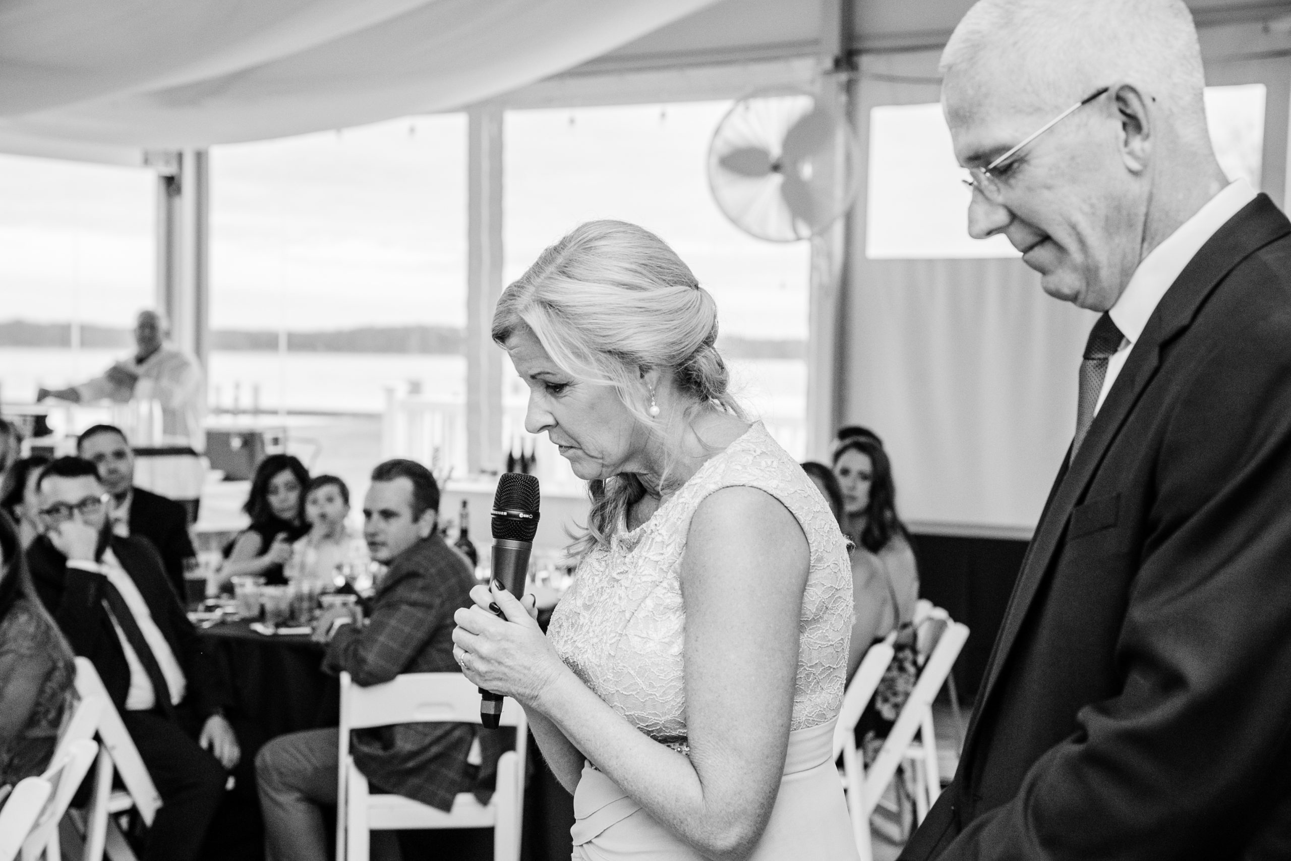 The tent is an 80’x50′ enclosed (but can open) tent with a solid floor, perimeter lighting, white draping from the ceiling, hanging greenery chandelier that add light and clear vinyl all along the waterside so your water view is always there. During events a cocktail area is set with string lighting, high top tables and a bar.
